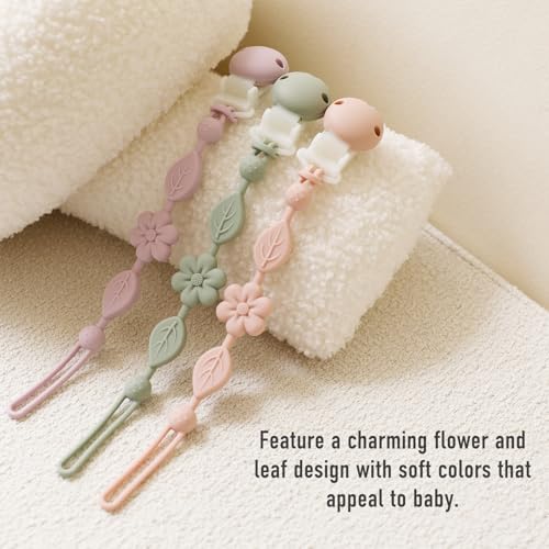Safety Is Priority: Unlike beaded or fabric designs on the market, our baby pacifier clips are made of food-grade silicone, ensuring no risk of breakage and BPA-free for your baby's safety. Upgraded Clip: Our clips are made of plastic and silicone, with rounded silicone parts to prevent scratches. They contain no metal parts, eliminating rust risks, and no wood parts, makes cleaning easy and thorough, parents can use them with peace of mind. Unique Design, Easy to Clean: The Baby Binky Clips feature a charming flower and leaf design with soft colors that appeal to babies. The one-piece design is easy to clean and can be washed and dishwasher safe. Ultra-Lightweight and Portable: Weighing only 0.06lb, your baby will hardly notice it's there. Comes in a beautifully crafted leather package, making it perfect for personal use or as a gift.